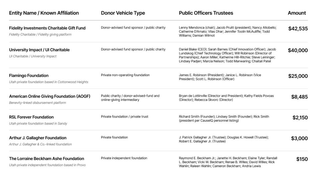 The donor base itself is a mix of individual giving and institutional channels. Public Form 990 filings from grant-making organizations show donations to the foundation have come from both donor-advised fund sponsors — the large intermediary charities that process giving on behalf of anonymous individual donors — and from named private family and corporate foundations, several of them Utah-based. Because donor-advised funds allow individual contributors to remain anonymous, the specific individuals behind the largest institutional grants are not publicly identified in the filings.